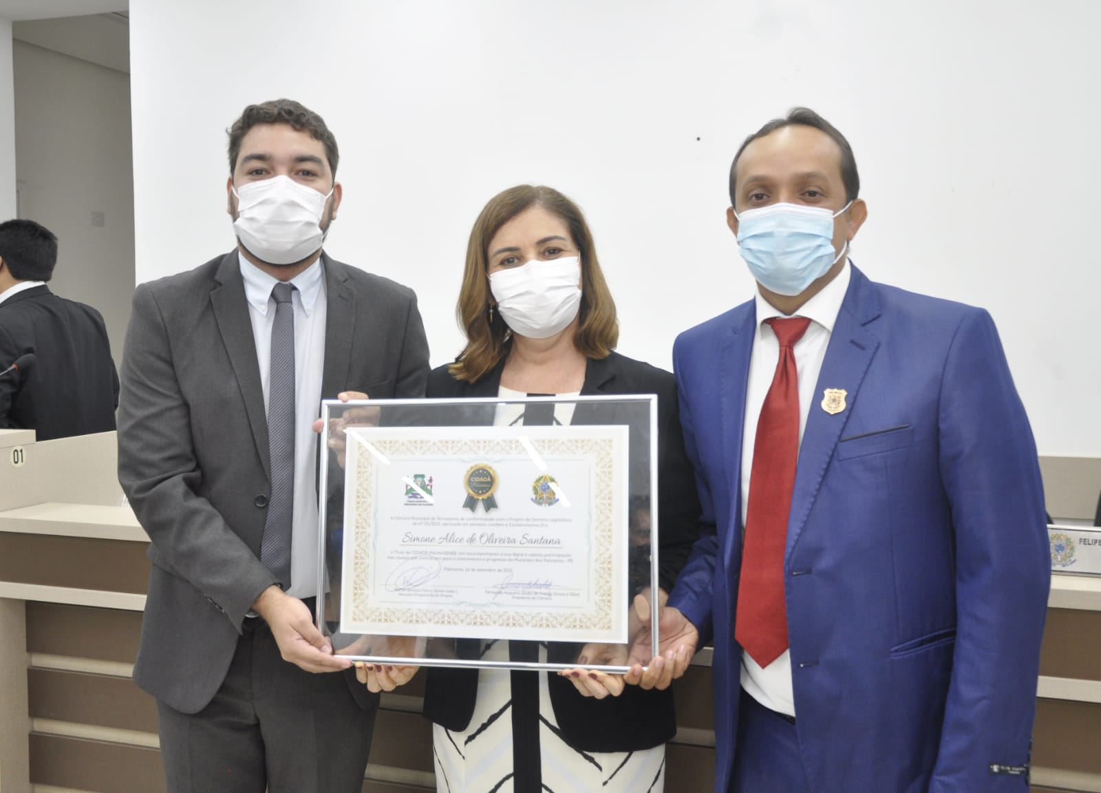 Na 22ª sessão legislativa do biênio 2021-2022, realizada no dia 14 de setembro, a deputada estadual Simone Santana recebeu, na Câmara dos Vereadores dos Palmares, o título de cidadã palmarense. A propositura foi do vereador Júnior Leão, e foi aprovada de forme unânime.