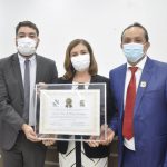 Na foto, o presidente da casa, Godoy de Bartô, ao lado de Simone Santana e Júnior Leão, vereador autor da propositura.